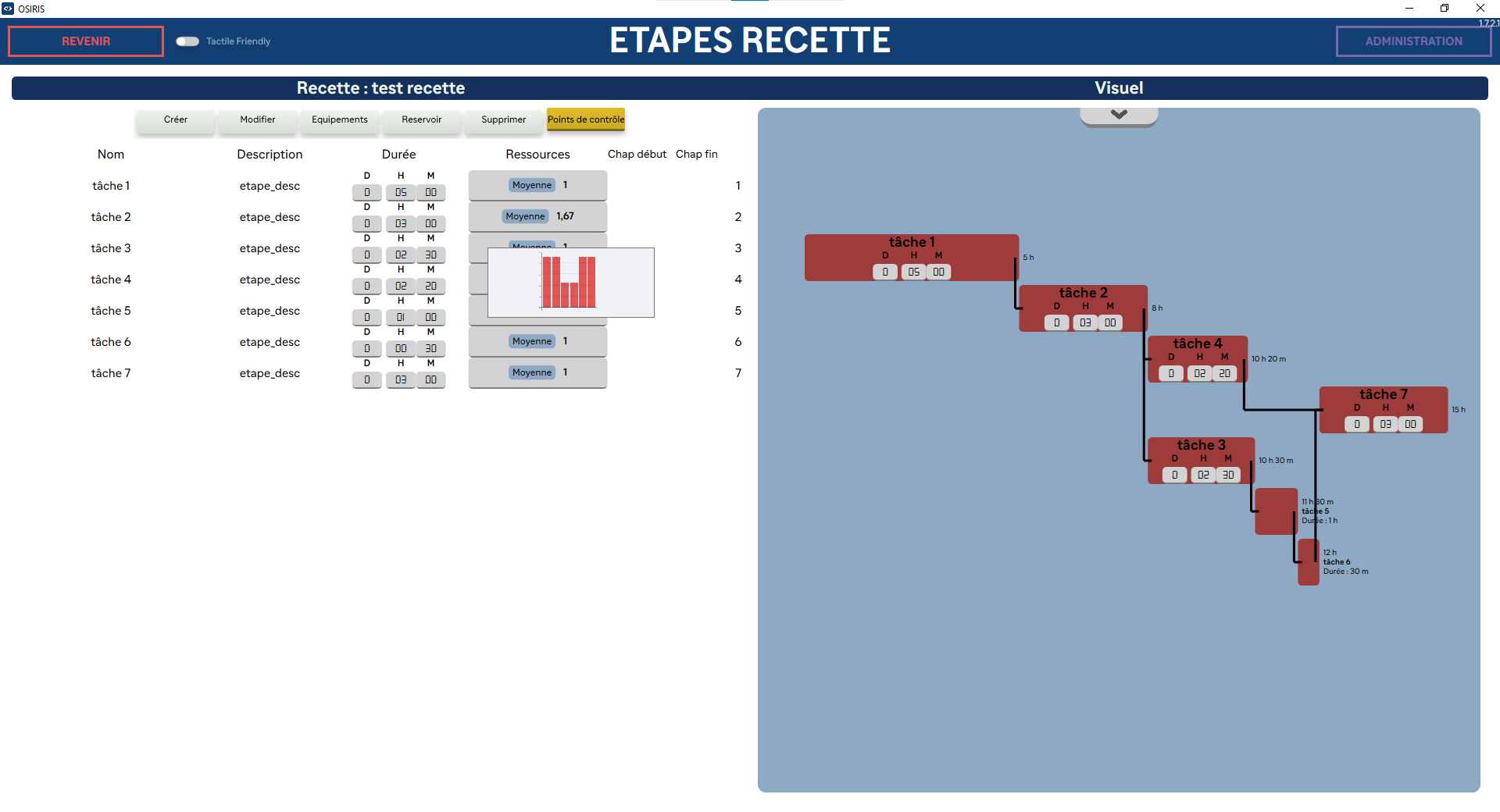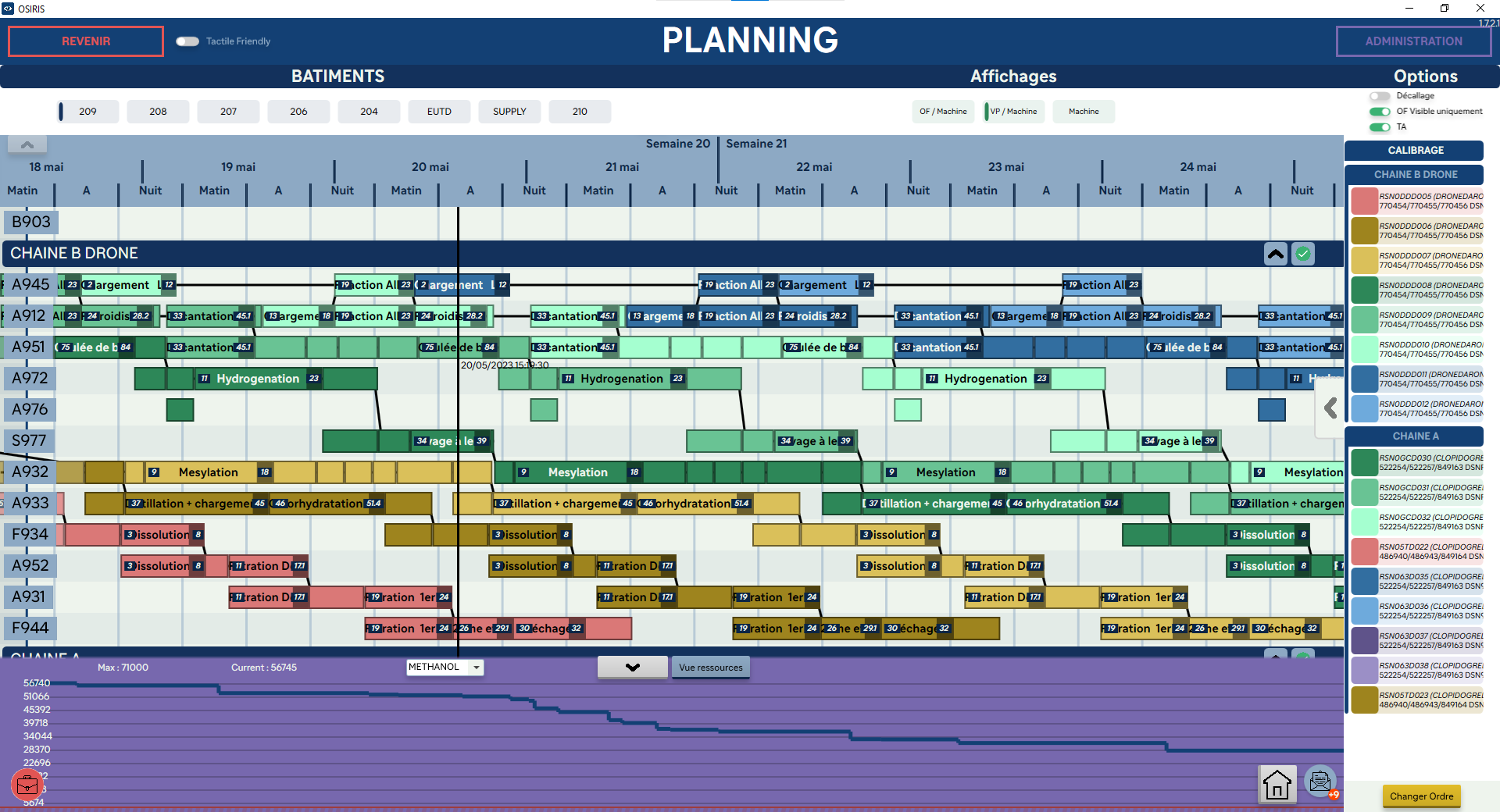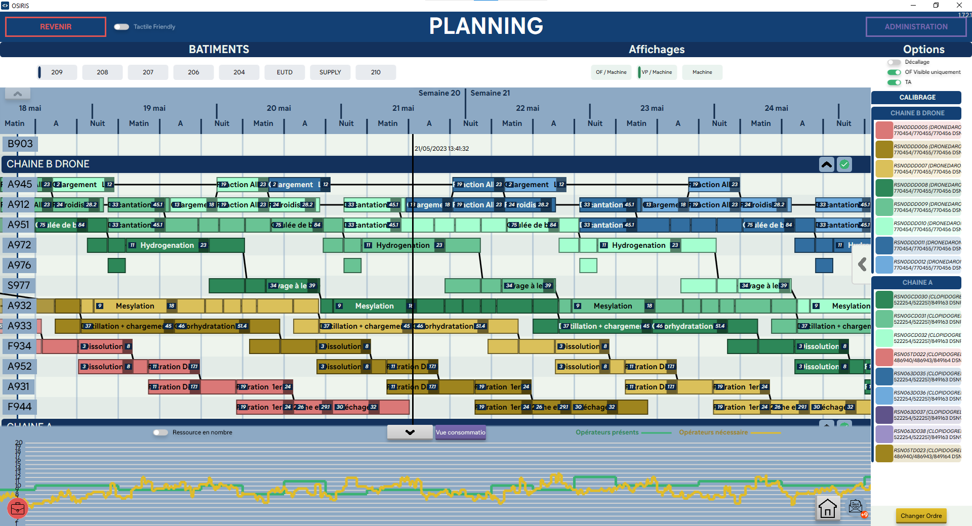 Le logiciel doit vérifier, pour chaque mouvement de planning, les contraintes des machines pour s’adapter à la réalité du terrain + afficher le nombre d’opérateurs nécessaire VS le nombre présent + prédictions des quantités de produits en stock et quand les ravitailler.